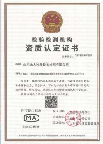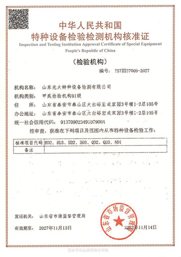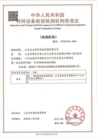山東光大特種設(shè)備檢測(cè)有限公司是經(jīng)山東省市場(chǎng)監(jiān)督管理局核準(zhǔn)的甲類(lèi)B1特種設(shè)備綜合檢驗(yàn)機(jī)構(gòu)。2017年9月30日取得了山東省市場(chǎng)監(jiān)督管理局頒發(fā)的《檢驗(yàn)檢測(cè)機(jī)構(gòu)資質(zhì)認(rèn)定證書(shū)》。2018年2月22日取得了山東省市場(chǎng)監(jiān)督管理局頒發(fā)的《特種設(shè)備檢驗(yàn)檢測(cè)機(jī)構(gòu)核準(zhǔn)證》(起重機(jī)械)檢驗(yàn)檢測(cè)資質(zhì)。2021年11月取得山東省市場(chǎng)監(jiān)督管理局版發(fā)的《特種設(shè)備檢驗(yàn)檢測(cè)機(jī)構(gòu)核準(zhǔn)證》(安全閥在線、離線)校驗(yàn)資質(zhì)。2023年11月取得山東省市場(chǎng)監(jiān)督管理局頒發(fā)的甲類(lèi)檢驗(yàn)機(jī)構(gòu)B1《特種設(shè)備檢驗(yàn)檢測(cè)機(jī)構(gòu)核準(zhǔn)證》,具有壓力容器(RD2...